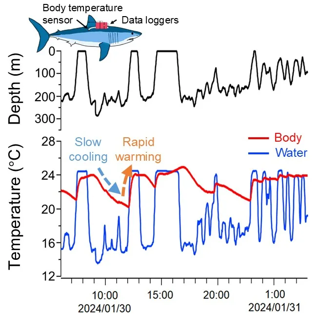 In this study, we attached data loggers to shortfin mako sharks caught off southeastern Taiwan to record water temperature, body temperature, and swimming depth (Fig. 1). During repeated deep dives, the body temperatures slowly decreased in deep cold waters, and rapidly increased when they returned to warm surface waters (Fig. 2). Their warming rates were over 10 times higher than their cooling rates, only comparable to bigeye tuna and swordfish among fish species studied to date. Since deep waters contain abundant food resources, regional endothermy likely helps them stay longer in prey-rich deep waters while minimizing recovery time at the surface.
