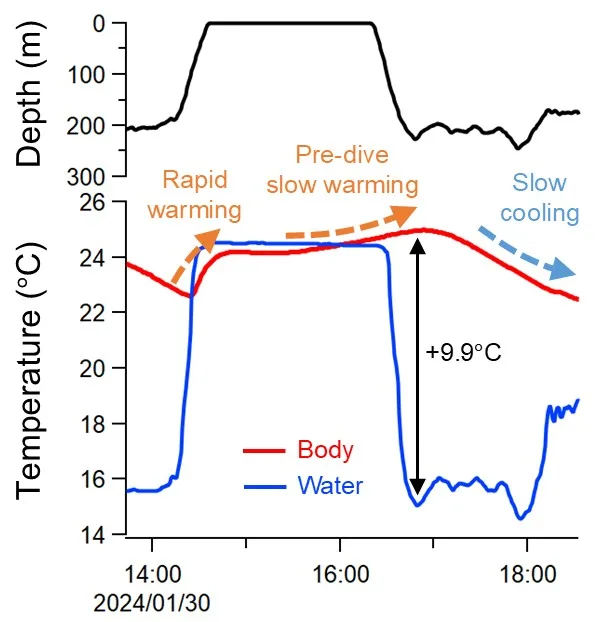 Figure 3. A unique body temperature change recorded from a mako shark. After rapid warming at the surface, the shark further increased its body temperature before a dive into the deep cold water.