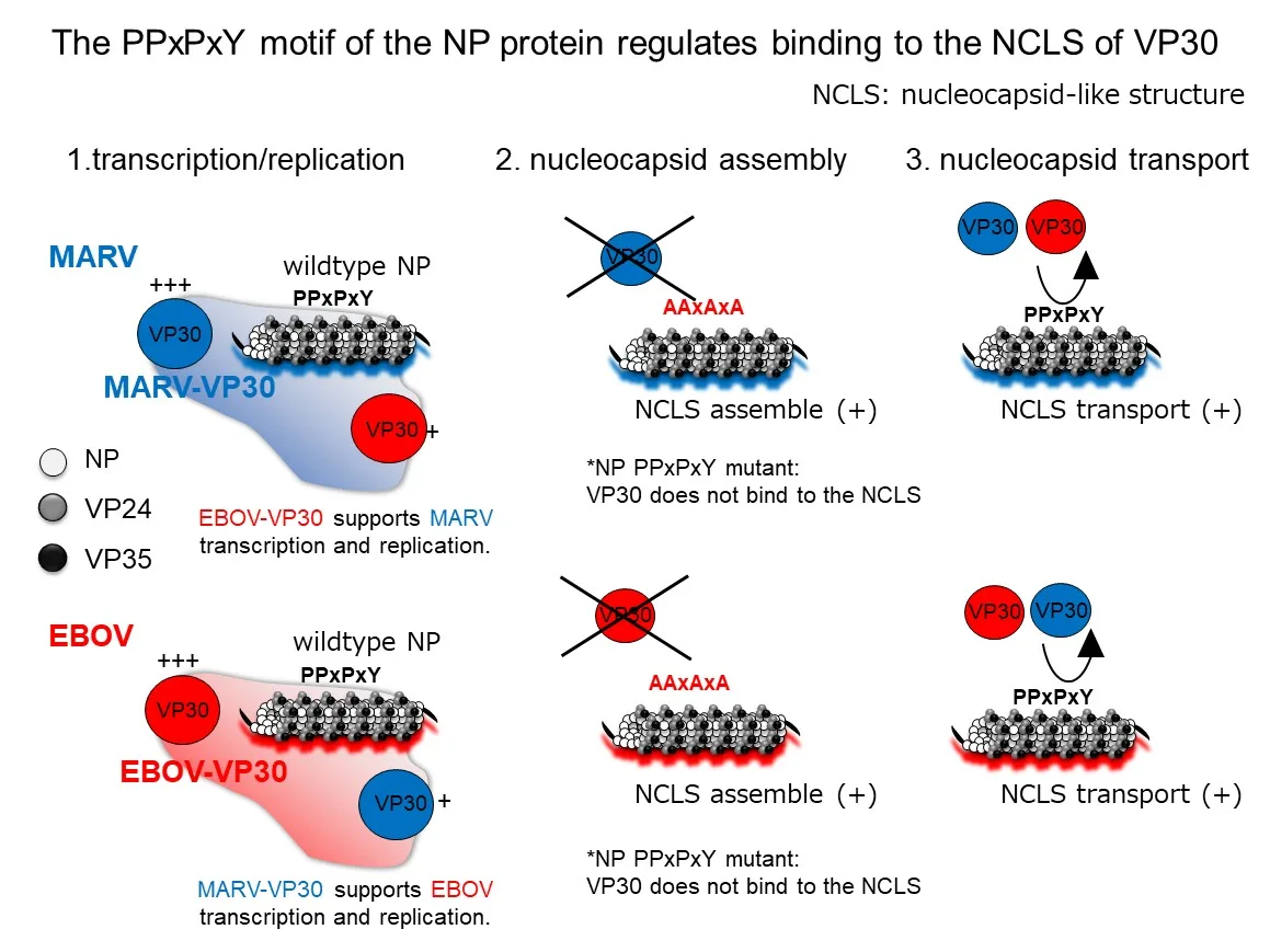Furthermore, we revealed that the PPxPxY motif located at the C-terminus of NP protein in both viruses is essential for the interaction between NP and VP30, highlighting the importance of VP30 in nucleocapsid assembly. Since this motif is conserved among filoviruses, it suggests a potential target for the development of novel antiviral drugs.