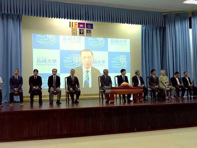 At the opening of the symposium, following the national anthems of both countries, a video message from Nagasaki University President NAGAYASU Takeshi was shown. This was followed by opening remarks from Mr. UENO Atsushi, Ambassador of Japan to Cambodia, and Dr. Hong Kim Cheang, Secretary of State of the Ministry of Education, Youth and Sport of Cambodia.