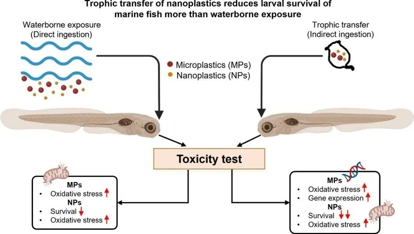 Using larvae of Pagrus major as a model, the study demonstrated that survival rates were significantly reduced in larvae ingesting NPs, with the lowest survival observed when NPs were ingested indirectly through zooplankton prey. This adverse effect was more pronounced than when NPs were directly ingested from the surrounding water.