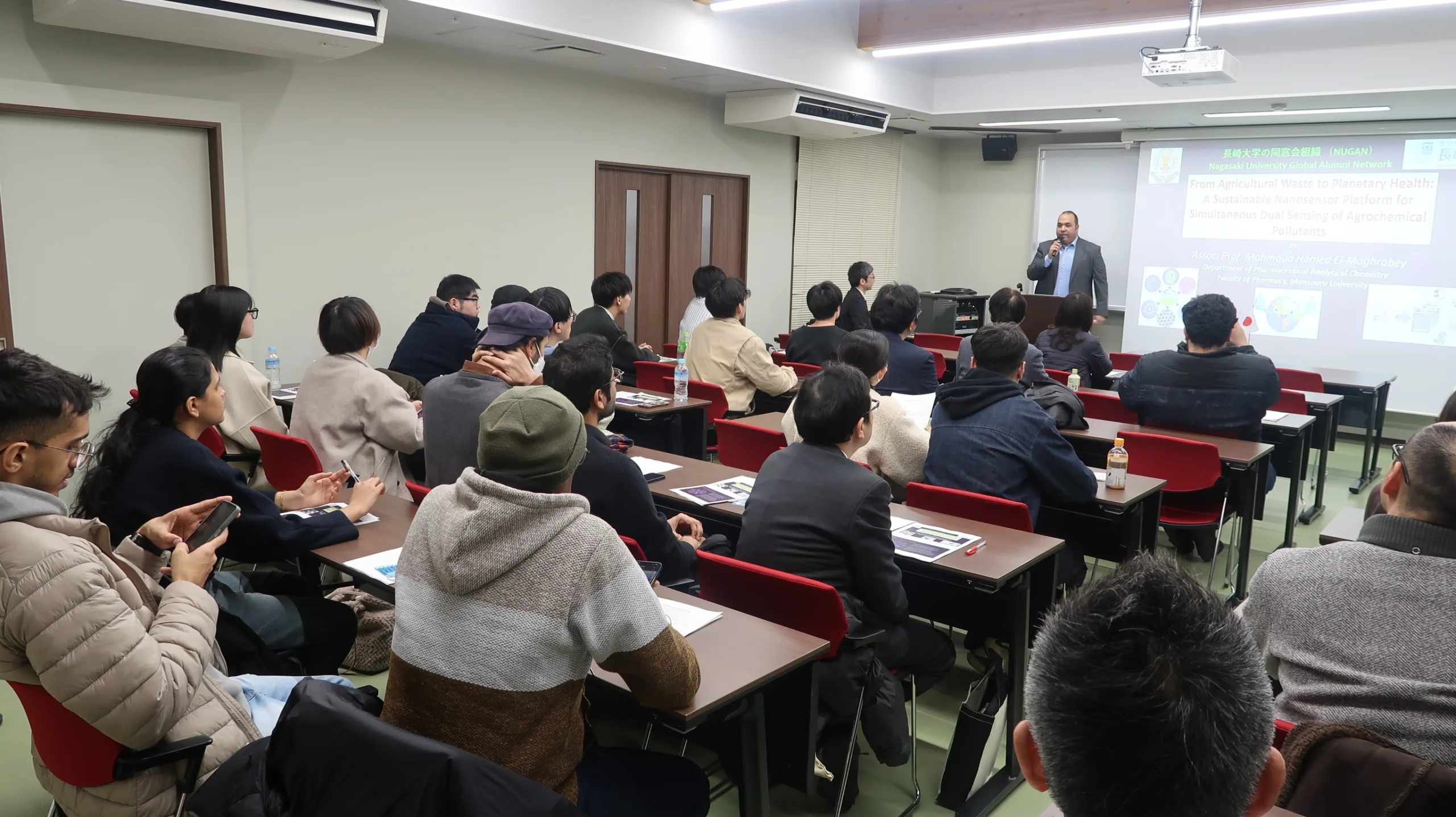 On Thursday, January 29, an international seminar titled “From Agricultural Waste to Planetary Health: A Sustainable Nanosensor Platform for Simultaneous Dual Sensing of Agrochemical Pollutants” was held at the Yeh Kuo-Shii Global Friendship Center on Nagasaki University’s Bunkyo Campus. The seminar welcomed Associate Professor Mahmoud Hamed El-Maghrabey of Mansoura University, Egypt, who is an alumnus of Nagasaki University’s doctoral program, as the guest speaker.