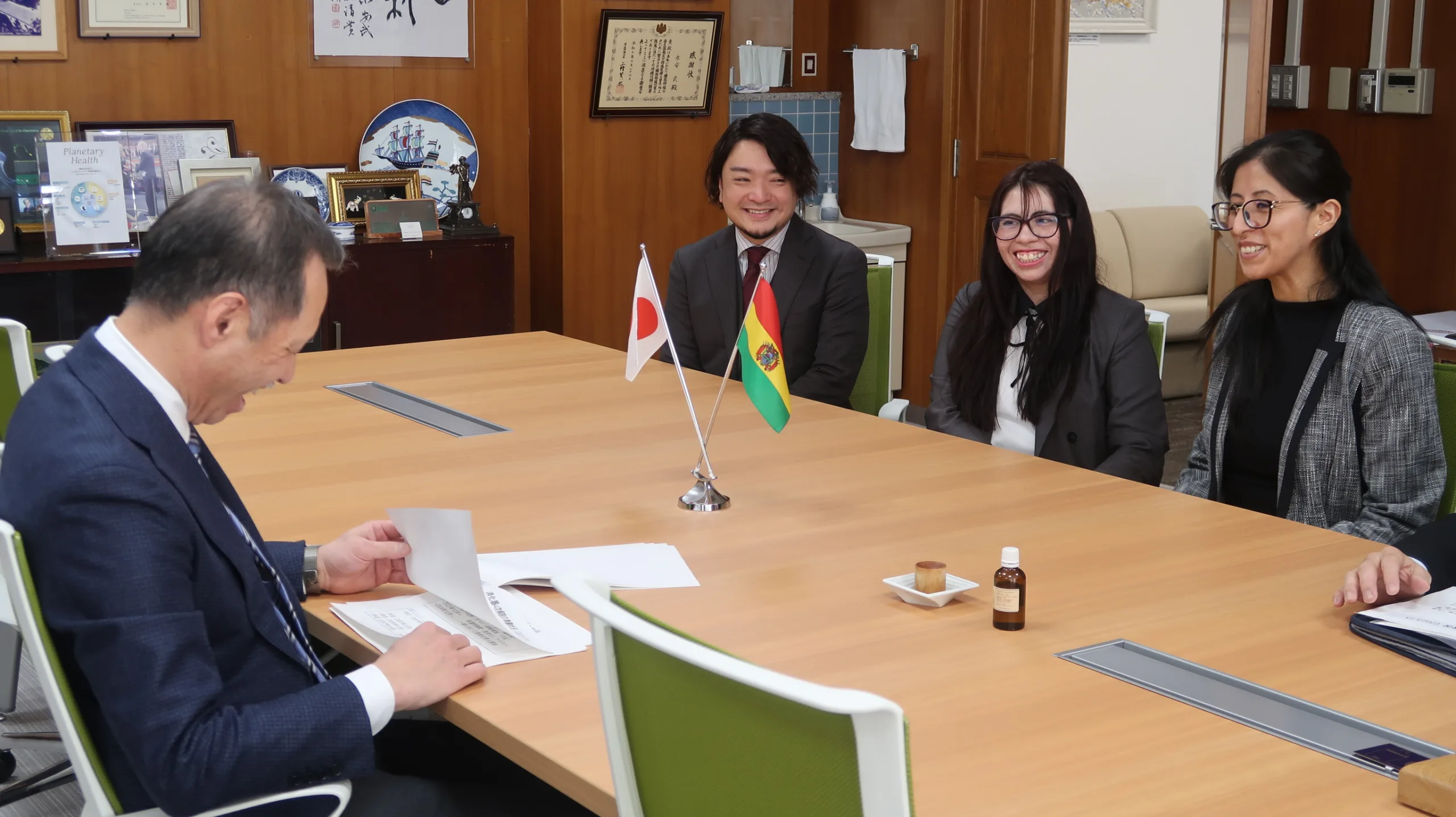 On February 12, 2026, two physicians from Bolivia, who have been staying in Japan for medical training, paid a courtesy visit to President Nagayasu prior to completing their specialized training at Nagasaki University Hospital.