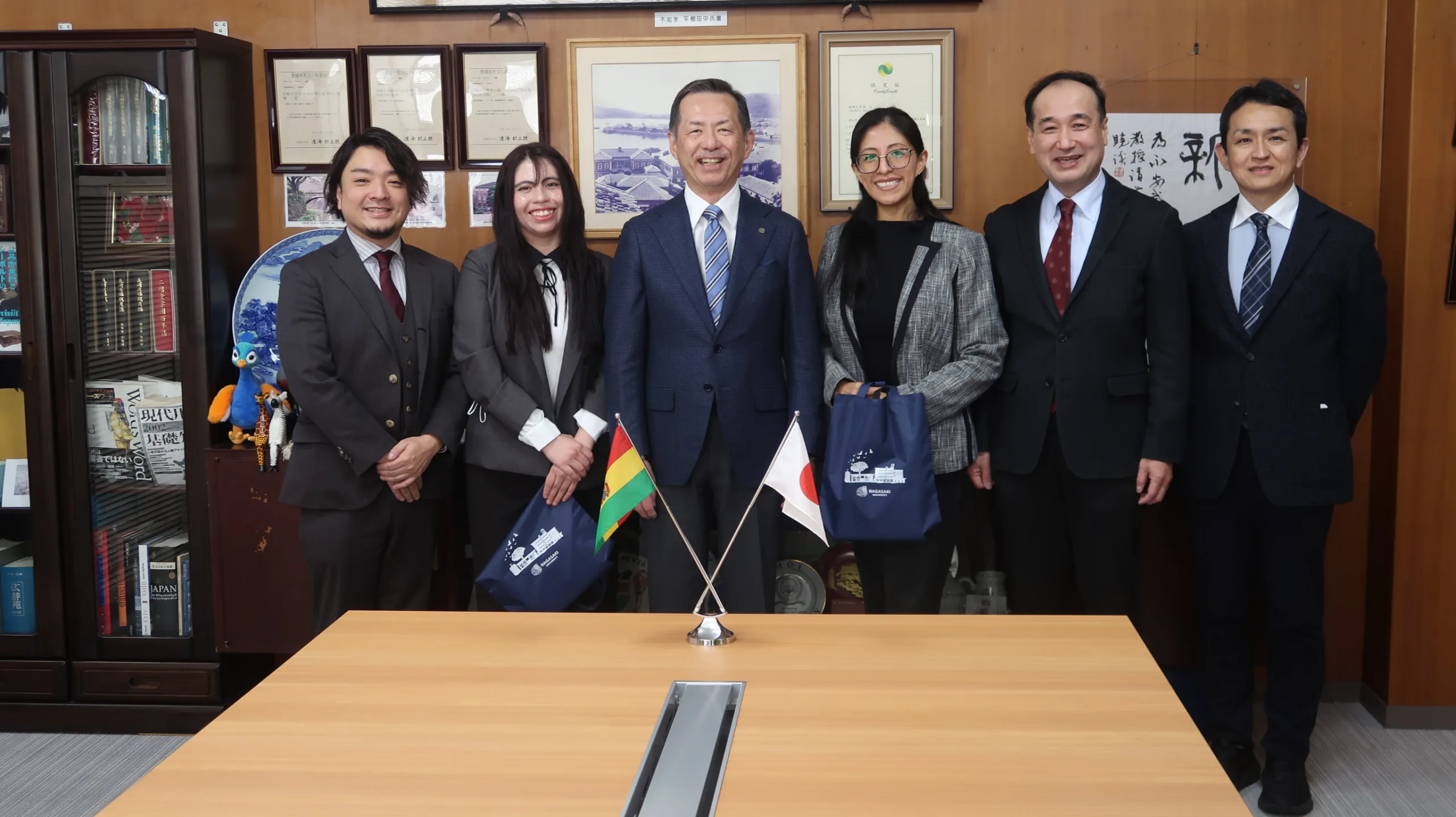 Two Doctors from Bolivia Pay a Courtesy Call on President Nagayasu upon Completion of Their Training at Nagasaki University Hospital