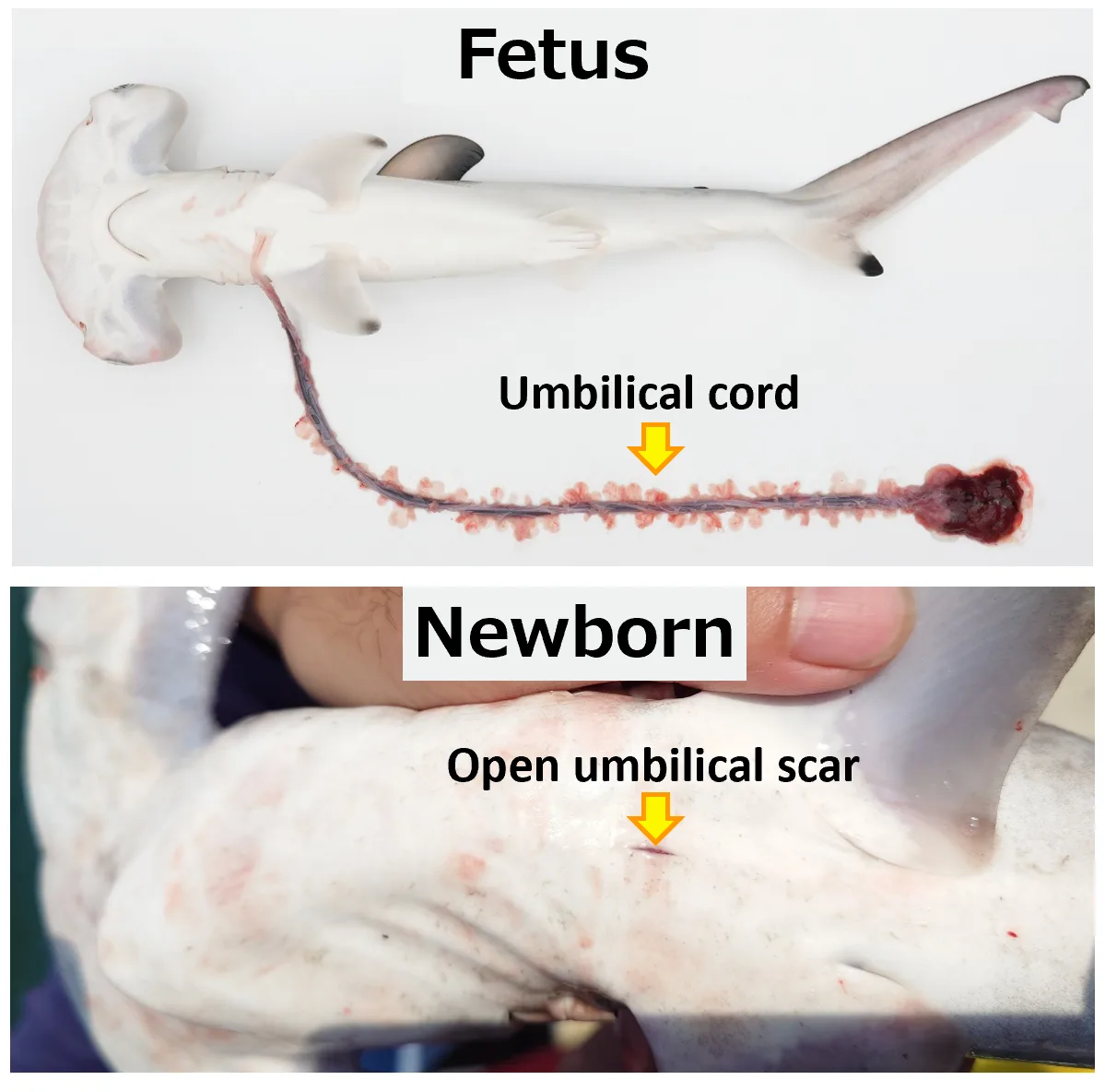 Figure 4 Scalloped hammerhead shark embryo and a newborn with an unhealed, open umbilical scar.