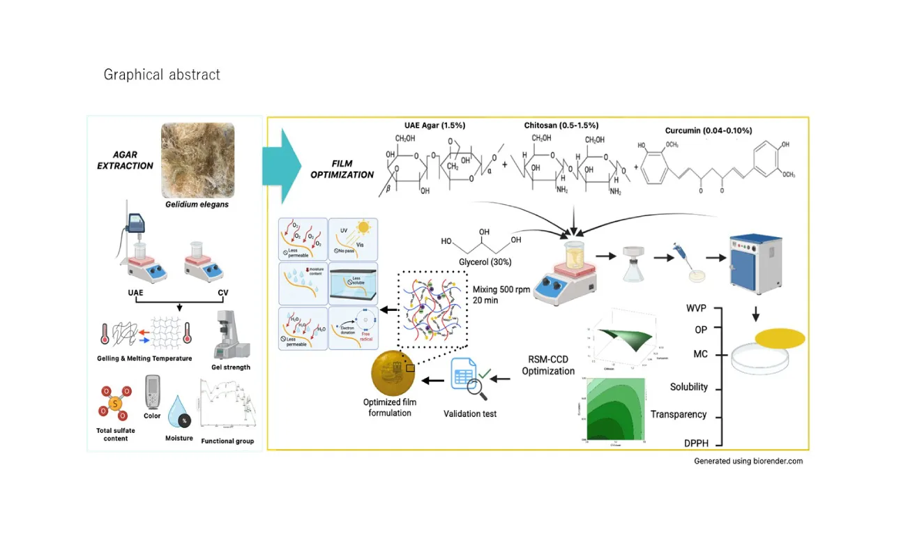 Valorization of agar extracted from Gelidium elegans via ultrasound-assisted extraction as potential film packaging by optimizing the incorporation of chitosan and curcumin